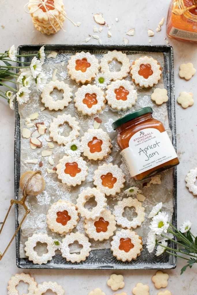 - Flip all of the bottom cookies upside down. Dollop 1 ½ tsp. of Stonewall Kitchen Apricot Jam into the middle of each cookie, then top it off with the top cookie.