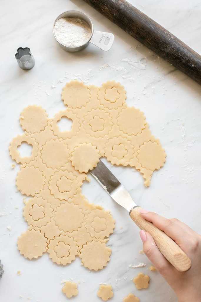 - Roll the dough out until it is ¼" thick. Use a 2" linzer cookie cutter to cut out the cookies.