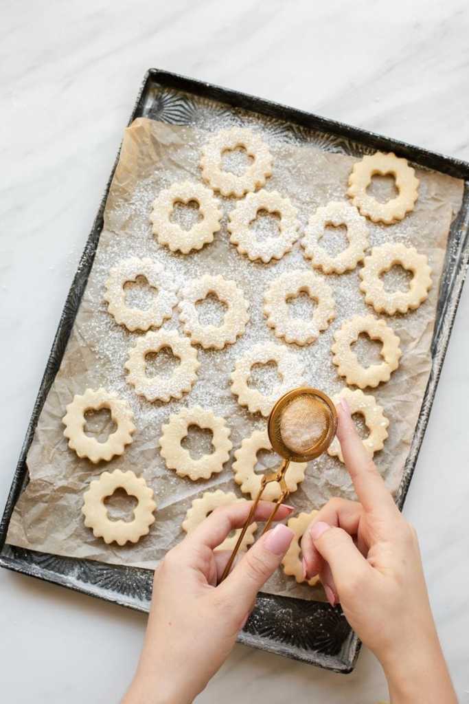 - Arrange all of the top cookies on a tray and give them a dusting of powdered sugar.