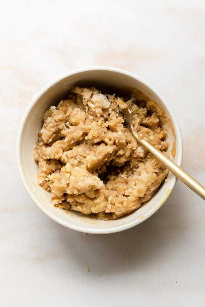 - In a small bowl, melt the butter. Add in the brown sugar, flour, cinnamon, and orange zest. Use a fork to mix the ingredients together, then set aside. The streusel will seem super buttery & become a cohesive dough, but will be able to be crumbled by the time we add it to the muffins.