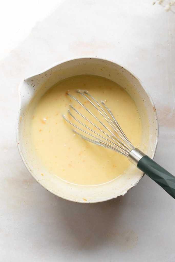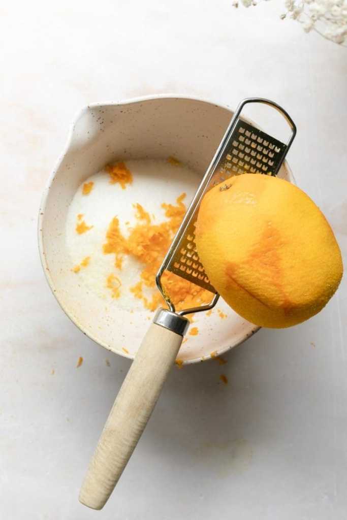 - Add the sugar to a medium sized mixing bowl, then zest the orange into the sugar. Use your fingers to rub the zest into the sugar.