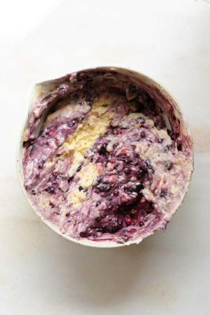- Add in the mashed blackberries, and fold the mixture a few times just to get some swirls of blackbery throughout the batter.