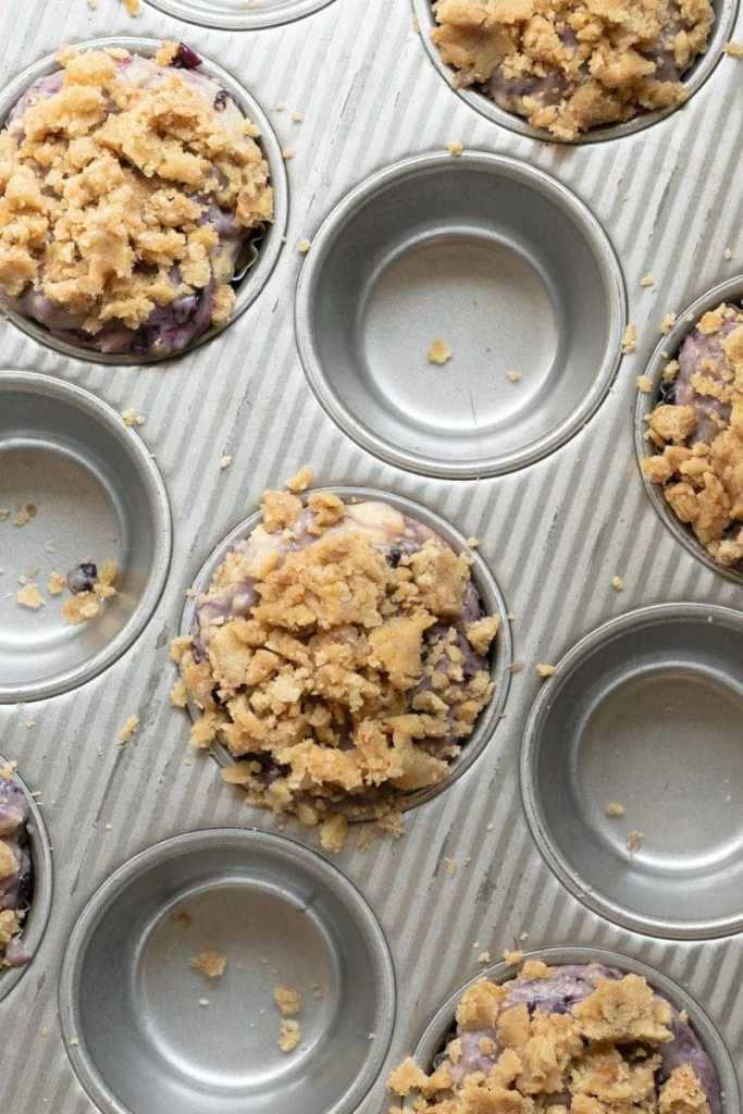 - Distribute the remaining muffin batter evenly (~3 tbsp. / muffin), followed by the remaining streusel.