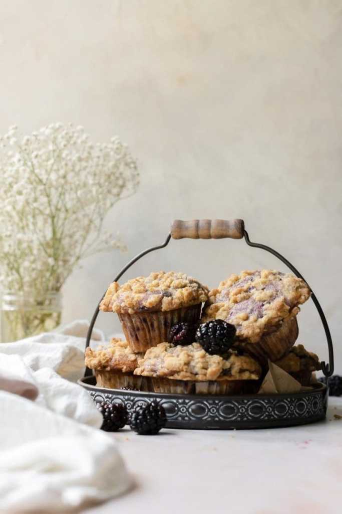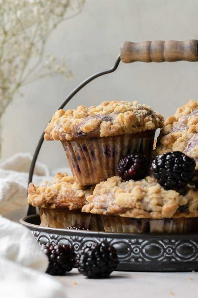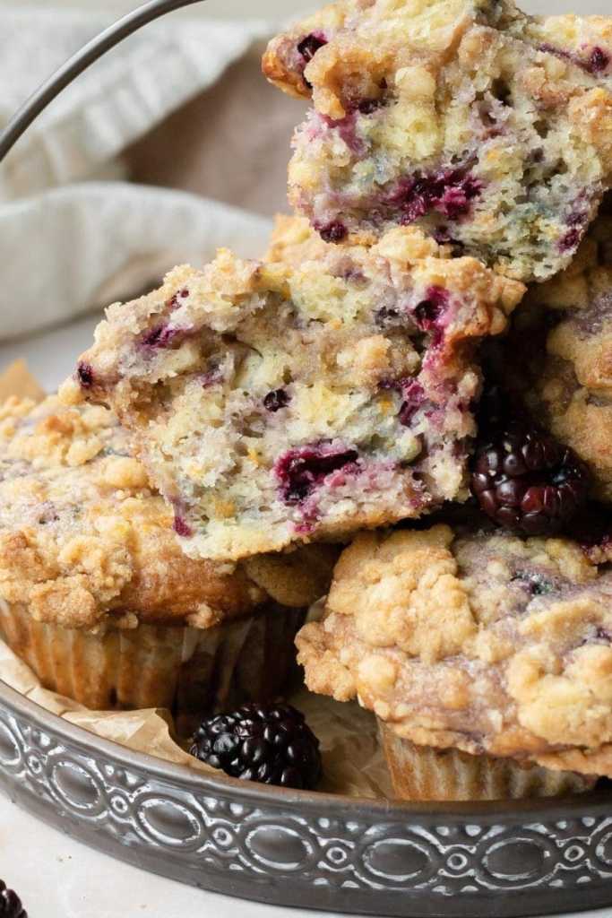 - They’re loaded with streusel and blackberries. There’s a layer of streusel inside of the muffins, and top of them. Also, we mash up the blackberries and swirl them into the batter for blackberry goodness in every bite.