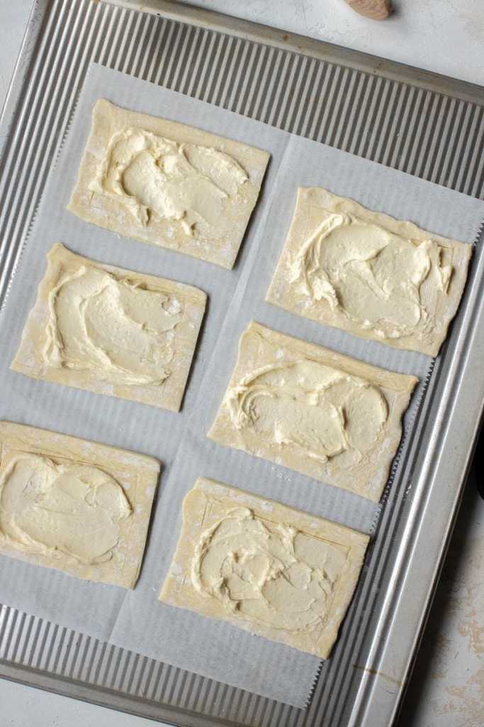 - Evenly distribute the cheesecake filling inside of the rectangle of each danish, then top with ~1 ½ tbsp. of curd.