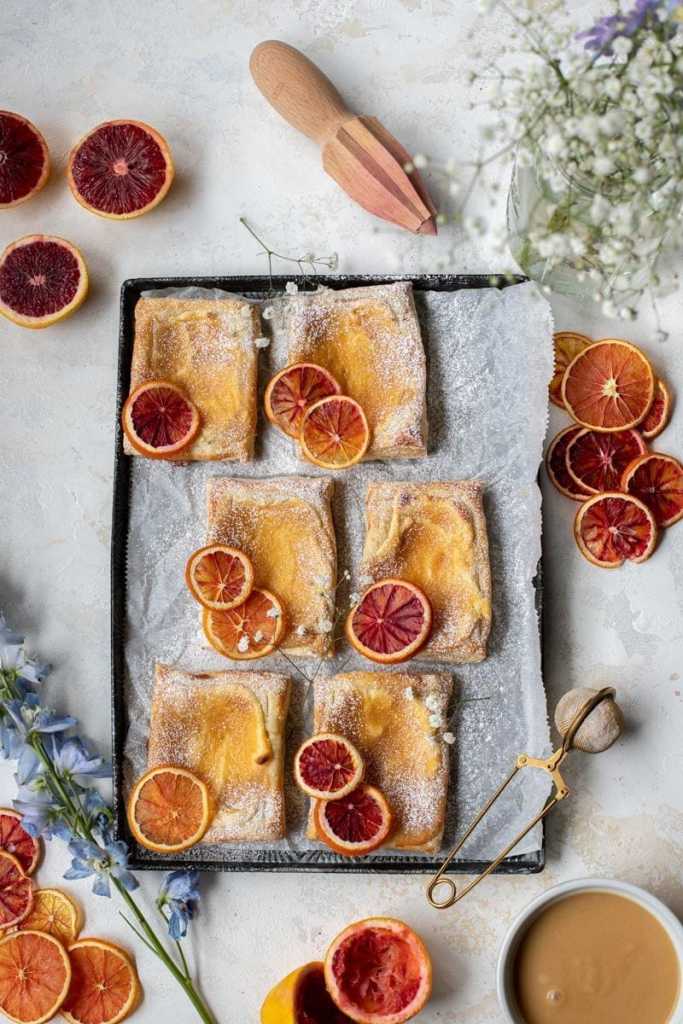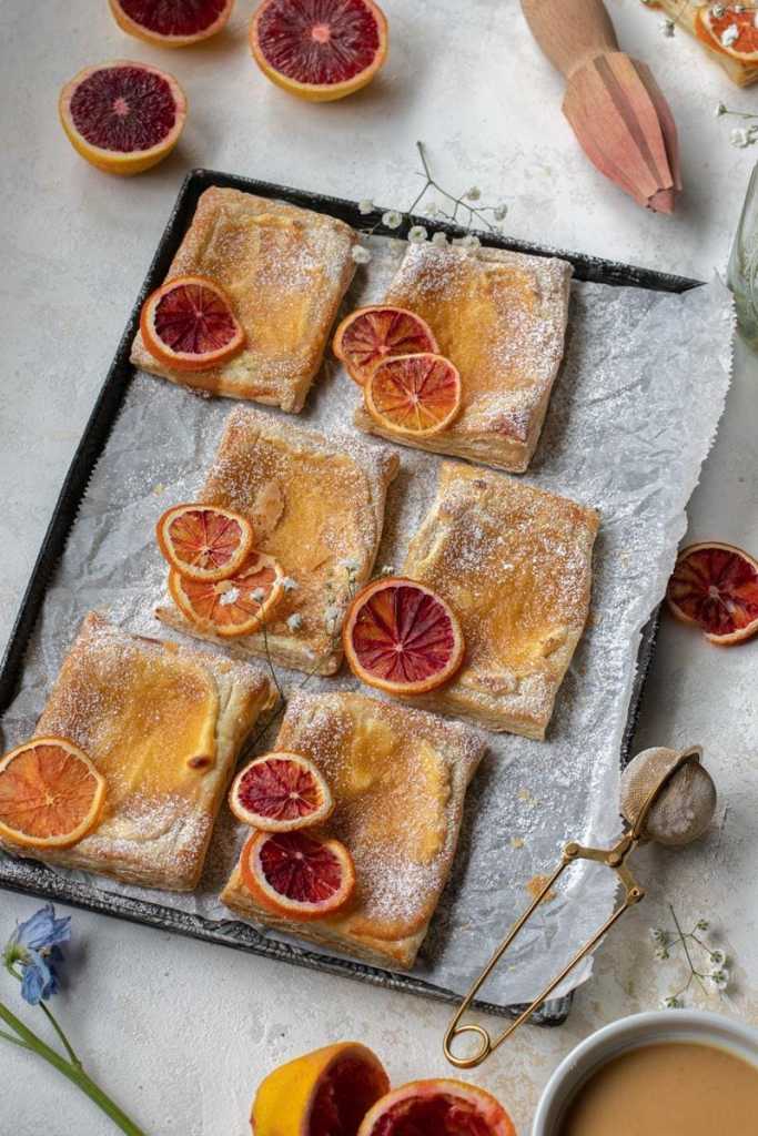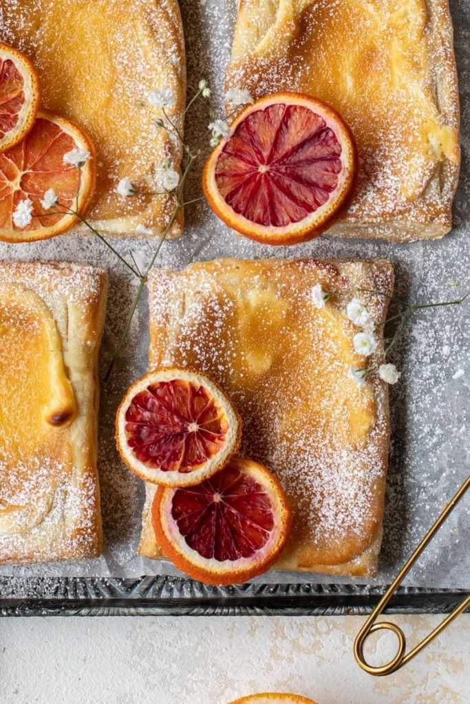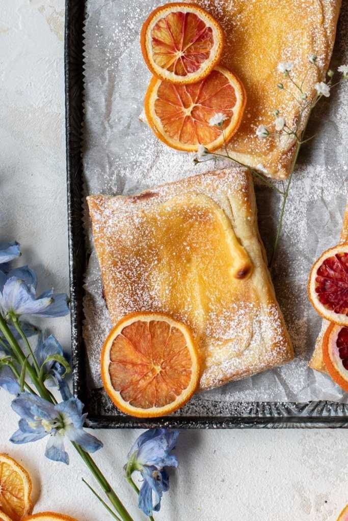 Flaky, buttery puff pastry topped with a sweet vanilla cheesecake filling and a flavorful blood orange curd.