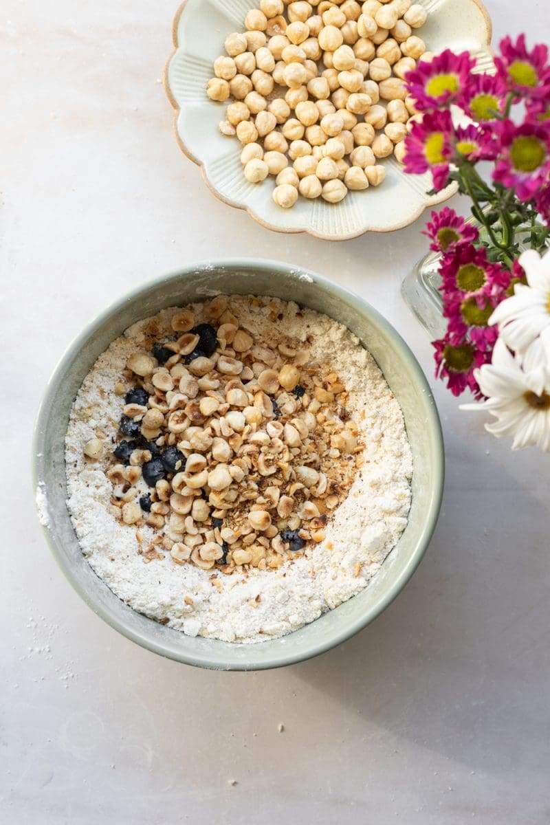 - Make a well in the center of the ingredients. Add in the sour cream/egg mixture, fresh blueberries, and crushed hazelnuts.