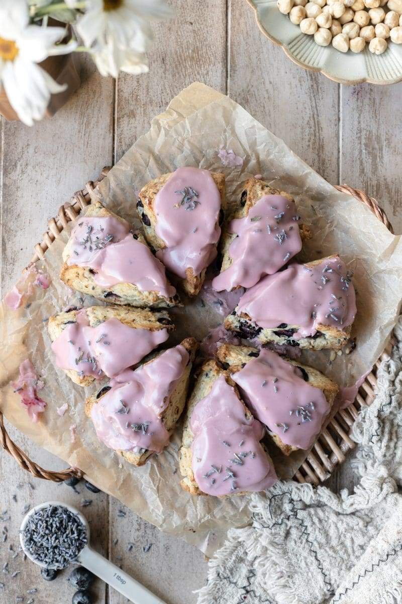 Flaky yet tender scones, filled blueberries and topped with a blueberry glaze