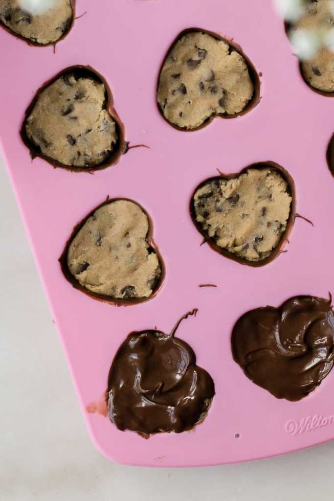 3. Fill the heart molds. Fill each heart mold with ~1 tbsp. of cookie dough, then pack it down into the molds. Top with more melted chocolate, then place it in the freezer to let it harden.