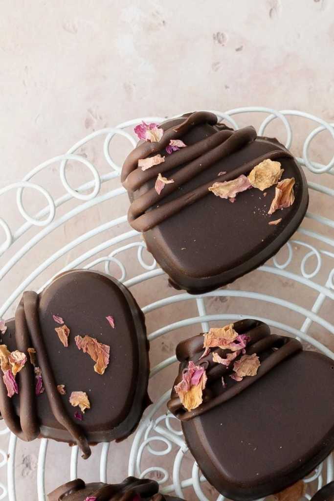 - Remove the cookie dough hearts from their molds, and (optional) drizzle with more melted chocolate, and rose petals.