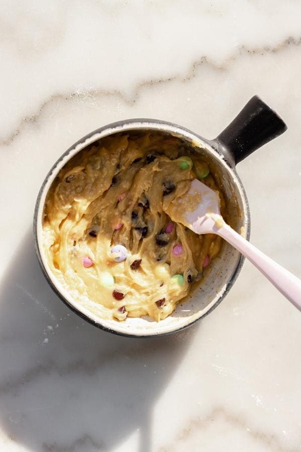 - Add in the m&m's and chocolate chips and fold the mixture together just until no flour streaks remain.