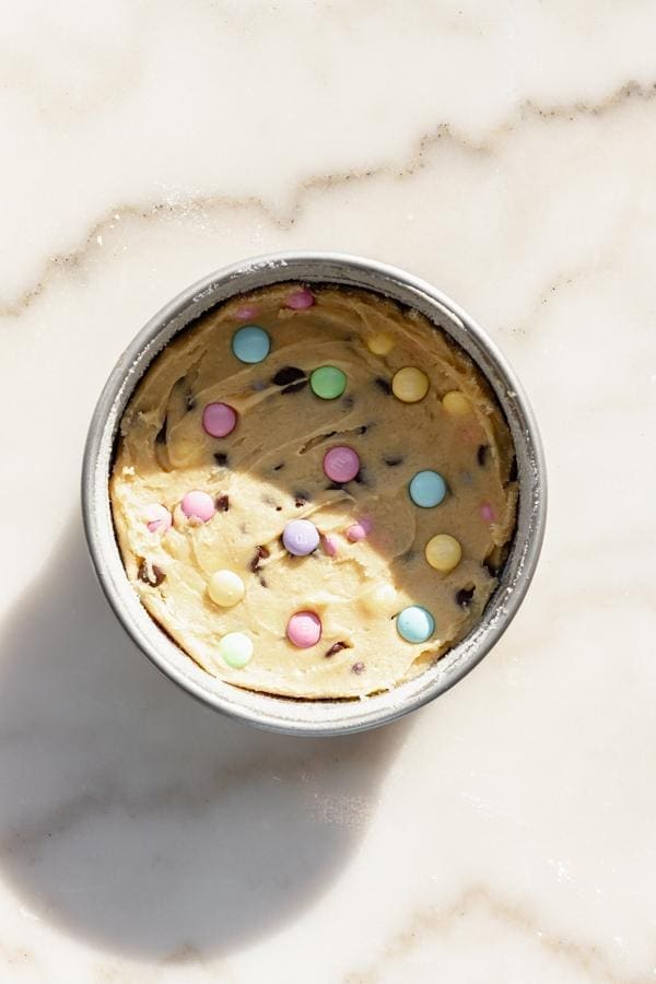 - Pour the dough into the 6" cake pan and top with additional m&m's if desired. Bake for ~20 minutes, or until the edges begin to turn golden brown. The middle may slightly jiggle but that's okay – it will continue to cook even after it's taken out of the oven.
