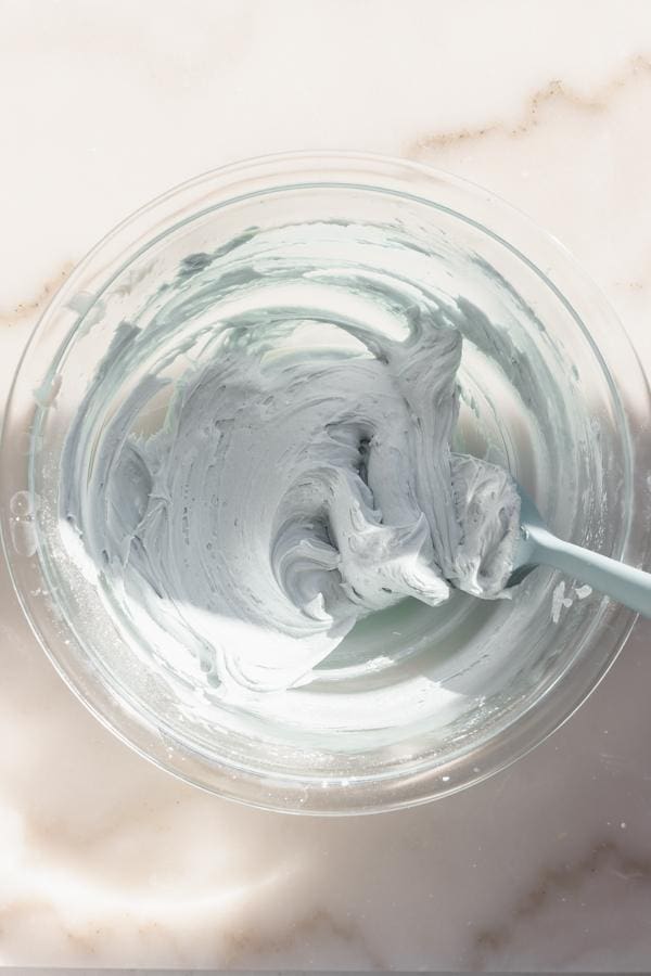 - Add in the vanilla, milk, and a small drop of blue food dye. Beat until combined, and add more food dye as desired.
