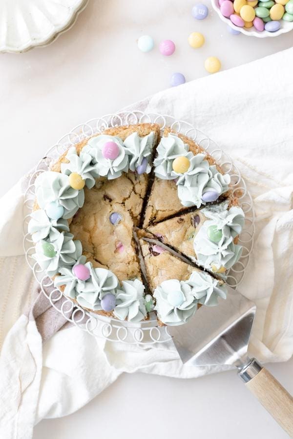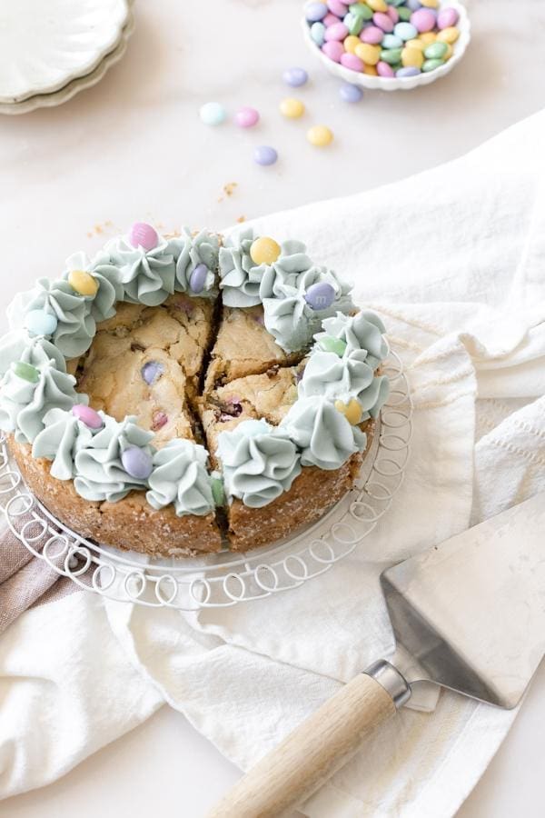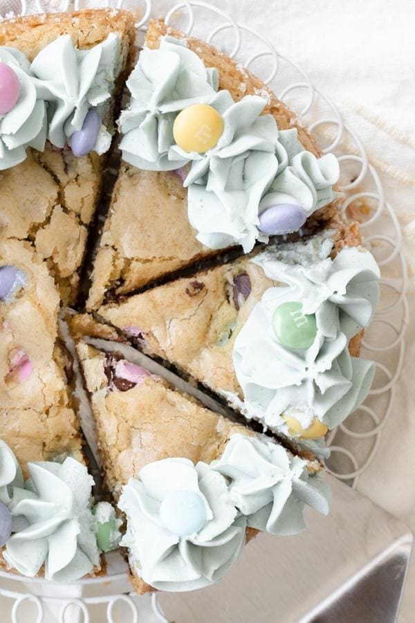 3. It’s festive! Who doesn’t love a good decorated cookie cake. This one’s loaded with some easter m&m’s, topped with a light blue colored buttercream and even more m&m’s.