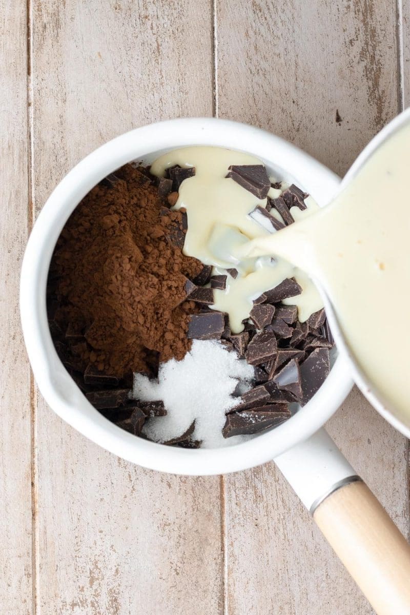 - Add the chopped chocolate, cocoa powder, sugar, salt, and eggnog to a small saucepan.