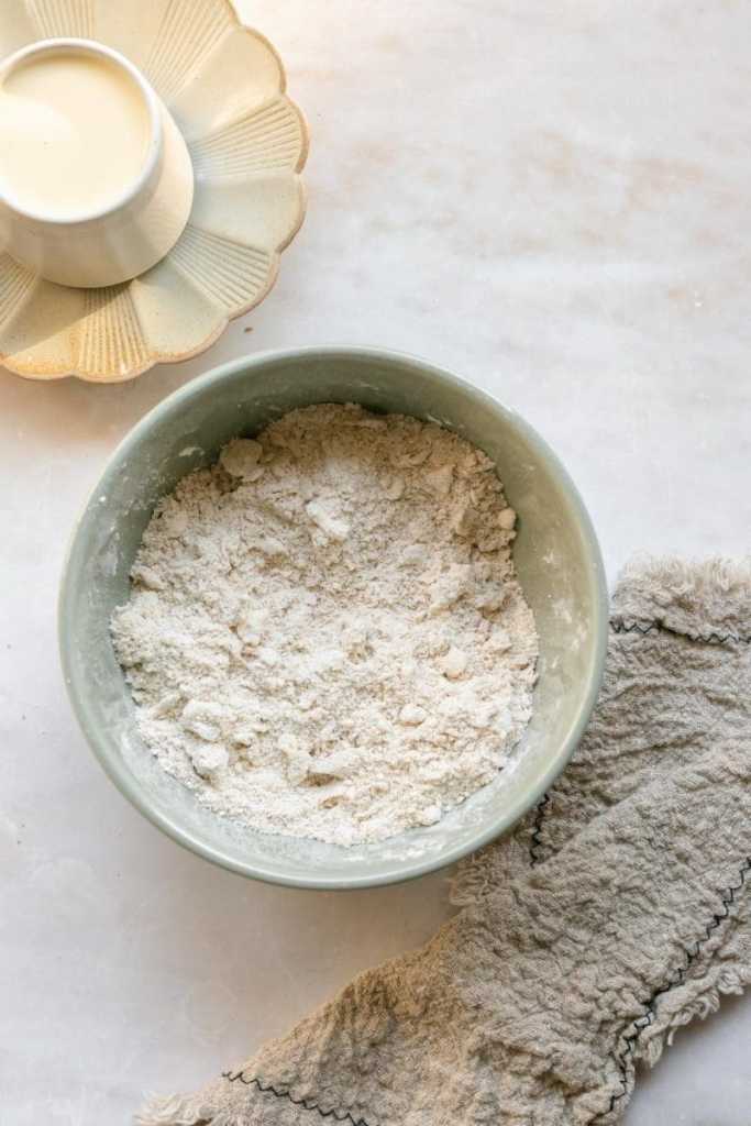 - In a medium-sized mixing bowl, add the flour, nutmeg, baking powder, salt, and sugar. Slice the butter into small cubes and add it to the dry ingredients.