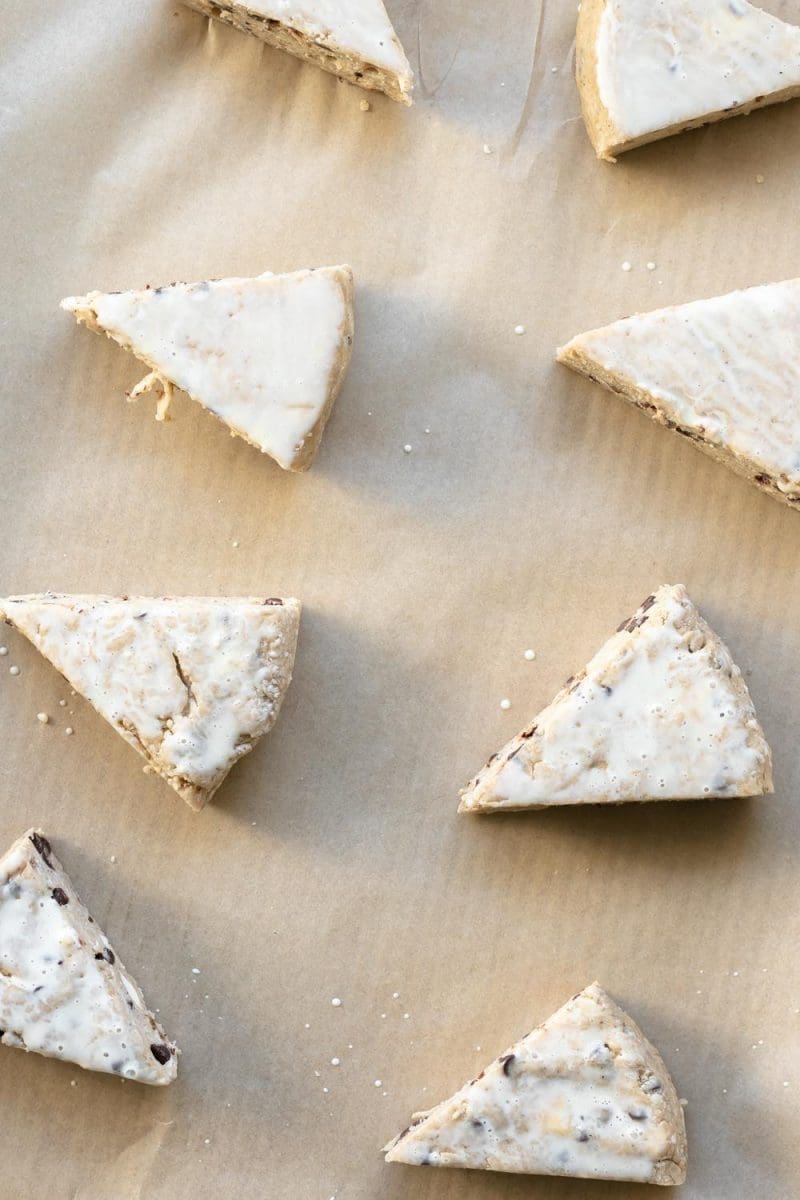 - Brush the tops of each scone with a bit of eggnog, then bake.
