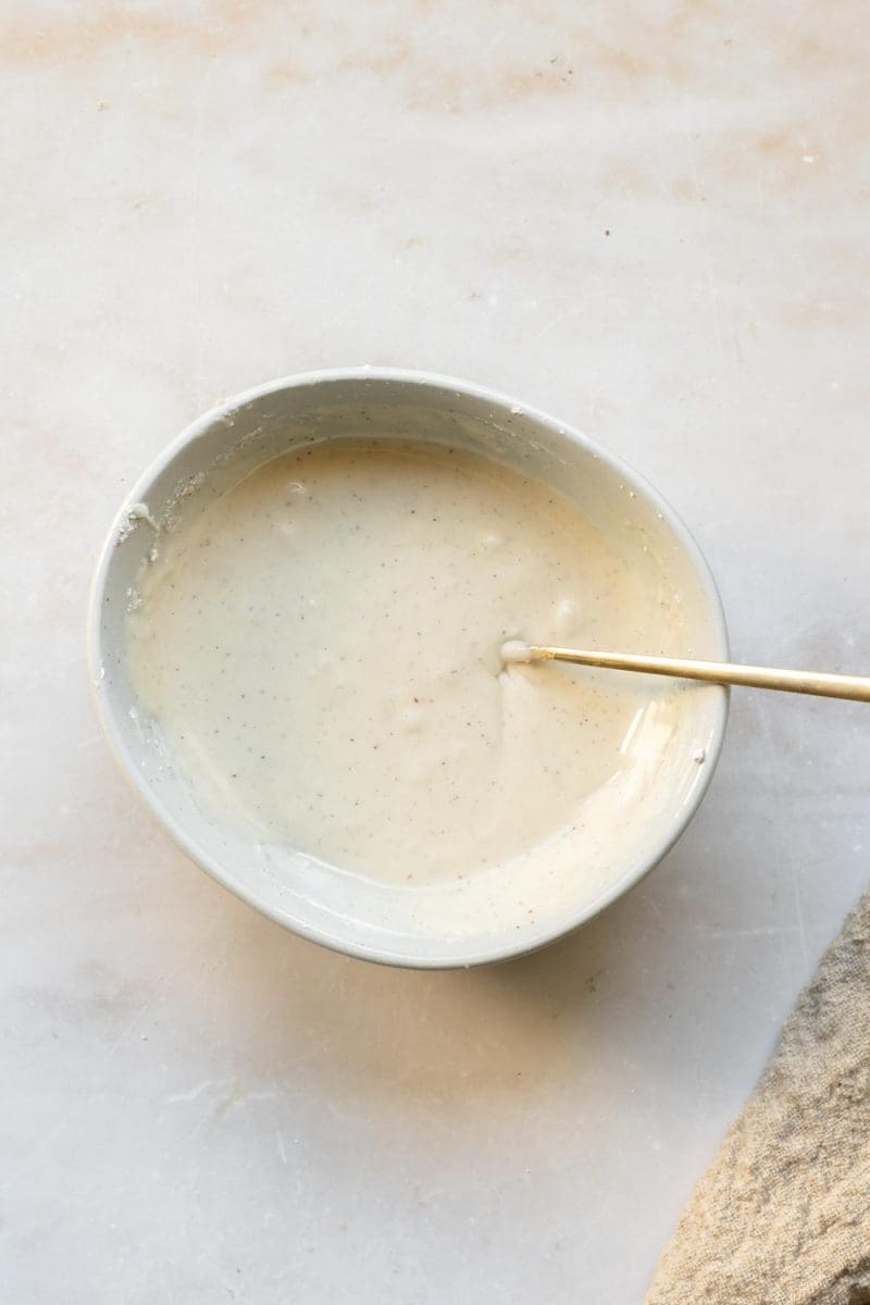 - Add the powdered sugar, nutmeg, vanilla bean paste, and 3 tbsp. of eggnog to a small mixing bowl. Whisk together, adding in more eggnog as needed to achieve your desired glaze consistency.