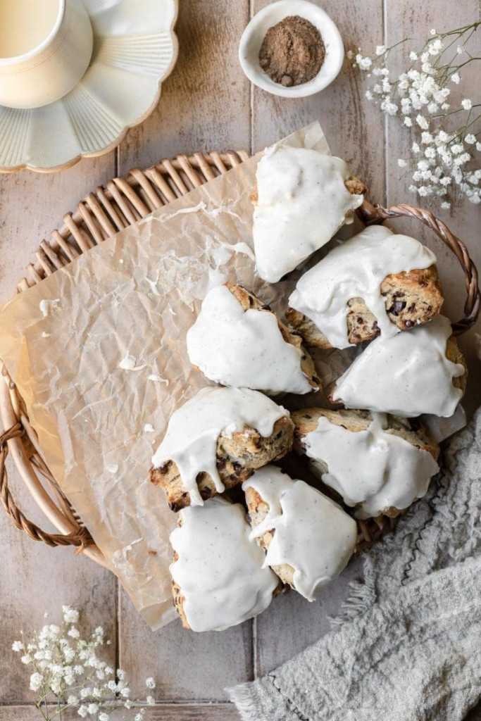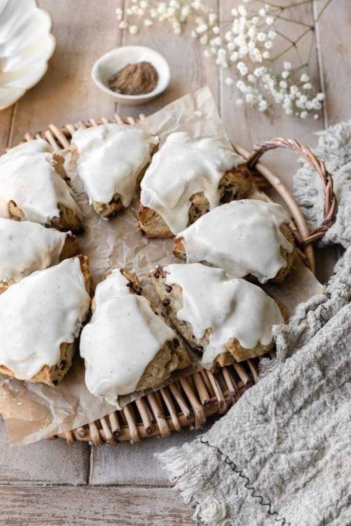 - Whisk the glaze ingredients together. Once the scones have cooled to room temperature, generously top them with the eggnog glaze. Serve and enjoy!