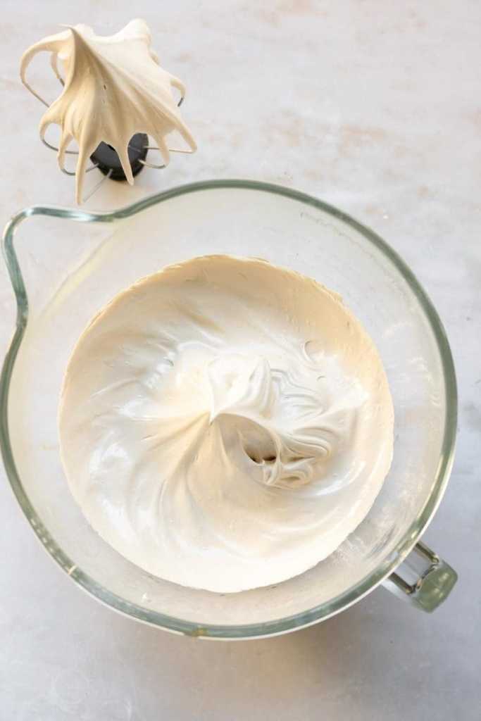 - Transfer the mixture to a stand mixer fitted with the whisk attachment. Whisk the mixture on medium speed until soft peaks form. Then, add in the salt and gingerbread spice and beat until stiff peaks form.