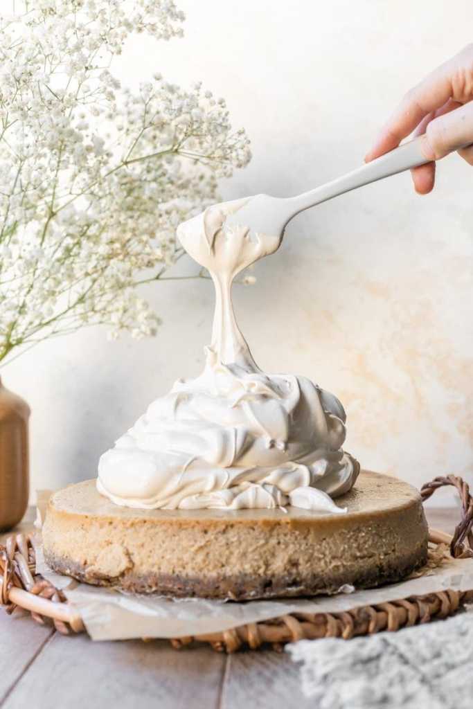 - Place all of the meringue on top of the cheesecake. If desired, use a culinary torch to torch the meringue.