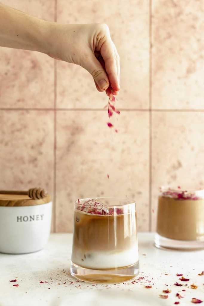 Honey: helps make the simple syrup. If you’re not a fan of honey, you could use a 1:1 substitution of agave or granulated sugar to have a simple iced rose latte!