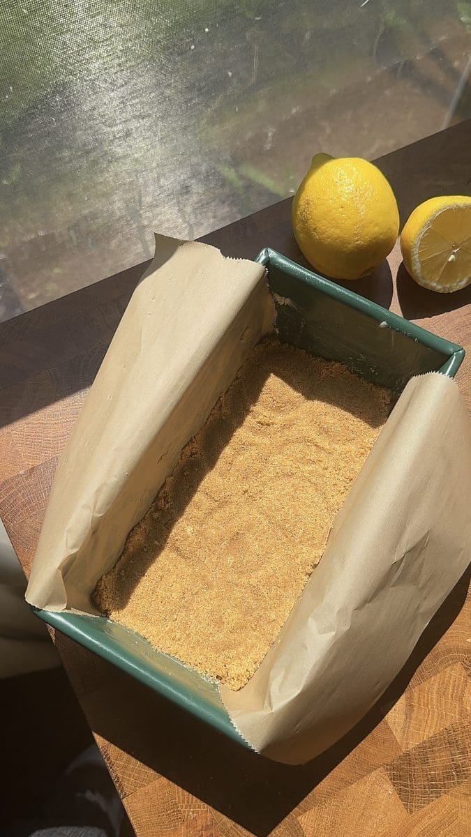 - Crush up the graham crackers and mix in melted butter. Press the crust into the loaf pan.