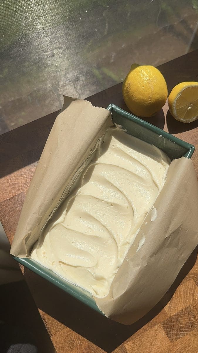 - Coat an 8×4" loaf pan with butter, then line it with parchment paper.