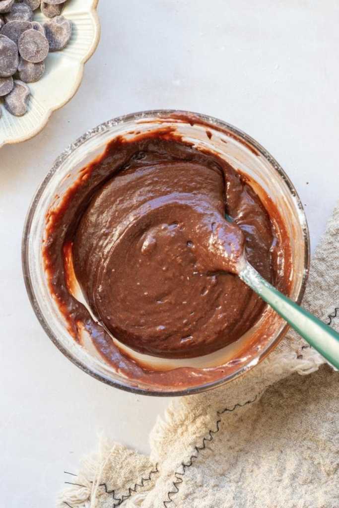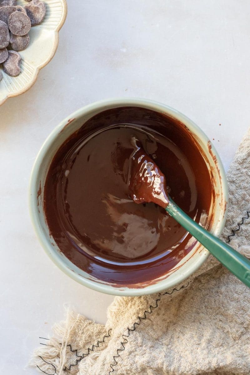 - In a small microwave safe bowl, melt together the chocolate chips and butter, stirring every 30 seconds until the mixture is smooth. Then, mix in the cocoa powder until smooth and set aside.
