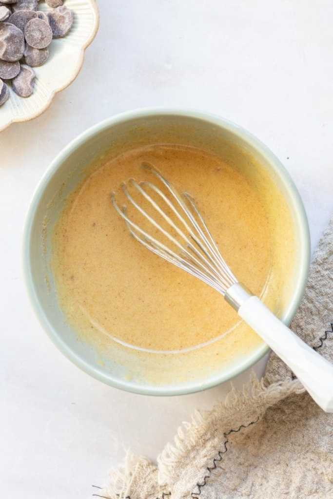 - To another small mixing bowl, add in the egg and brown sugar. Vigorously whisk the egg and sugar together for 1-2 minutes, until the mixture is light and fluffy.