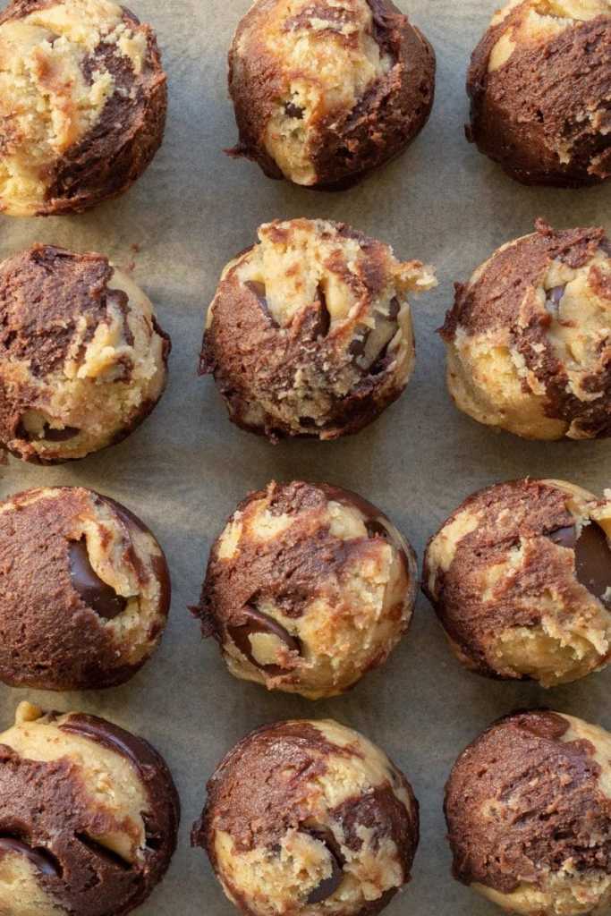 - Scoop out 2 tbsp. portions of the chocolate chip cookie dough. Then, remove the brownie cookie dough from the fridge and scoop out 1.5 tbsp. scoops of that dough.