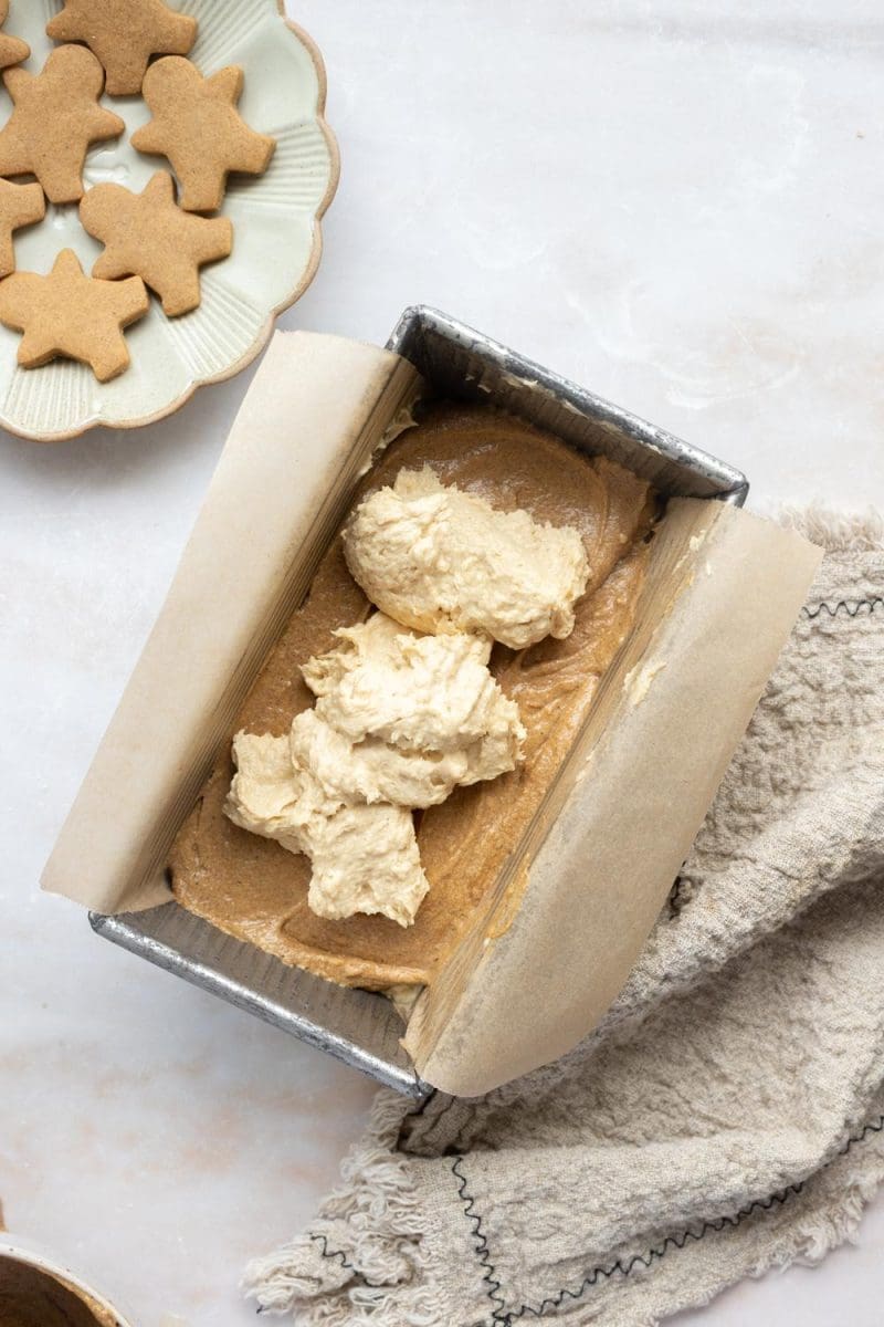 - Layer the vanilla and gingerbread batters in a parchment-lined loaf pan.
