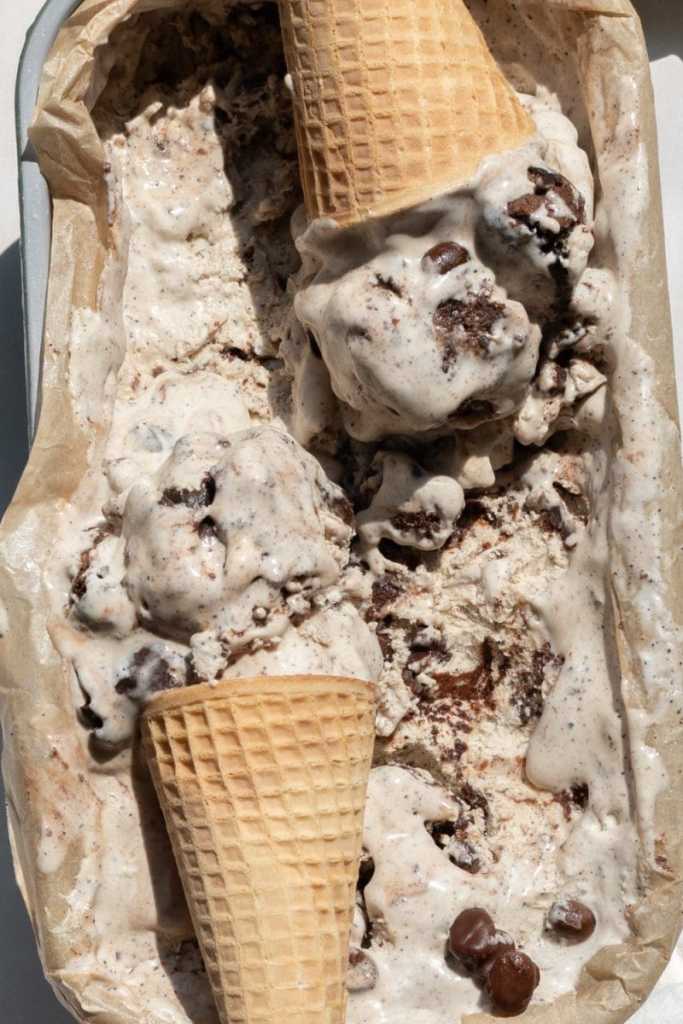 Coffee ice cream that’s no-churn, filled with fudge brownie bits & chocolate-covered espresso beans.