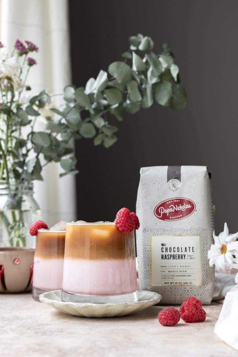 I love PapaNicholas Coffee and am so honored that I get to work with them! I seriously use their coffee beans every single day and am so happy to be able to spread my love of their coffee to you! Today I partnered up with PapaNicholas Coffee for this pink velvet macchiato and used their Chocolate Raspberry Espresso which combines notes of sun ripened raspberry and dark cocoa. I can’t recommend them enough, so please be sure to check them out! You can find their website by clicking here. And if you do end up purchasing their coffee be sure to use code FRESH20 which will get you 20% off any of their coffee!