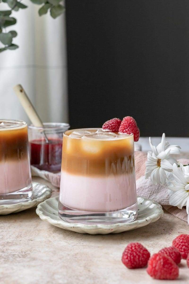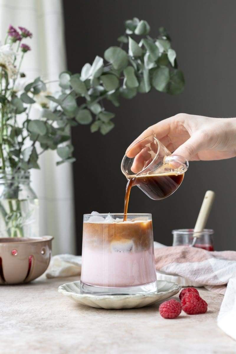 - Pour the espresso over the raspberry milk, then serve and enjoy!