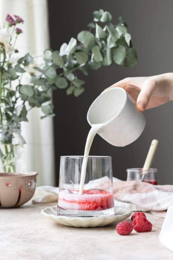 - Add in the milk, then mix the milk and raspberry syrup together.