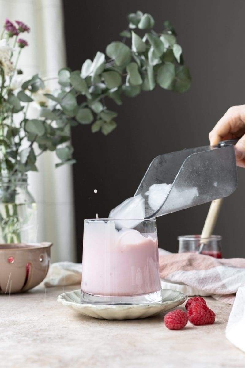 - Start by pouring 2 tbsp. of the raspberry syrup into your cup.