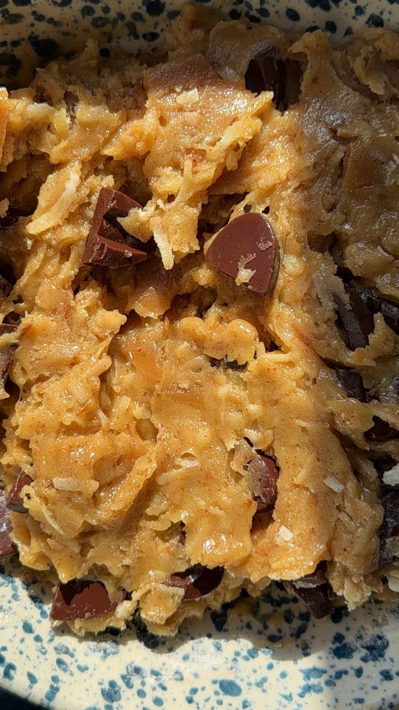 - Add in the toffee, chocolate, and toasted coconut and fold the mixture together just until no flour streaks remain. Cover the bowl tightly with plastic wrap and place it in the fridge for 30 minutes to firm up.*