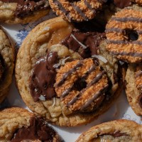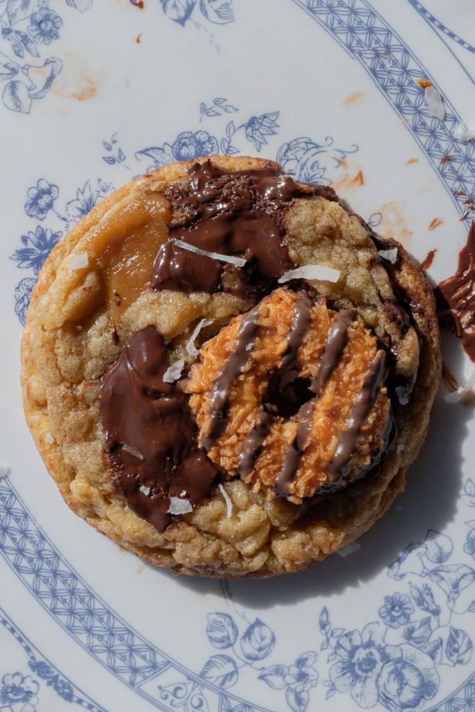 Samoas chocolate chip cookies that are loaded with brown butter, chocolate, toasted coconut, toffee, and topped off with a samoas cookie.