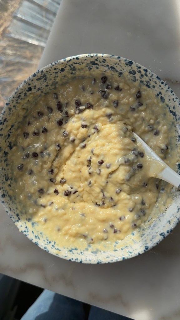 - Add in the chocolate chips and fold just until no flour streaks remain, and the chocolate chips have been evenly distributed.