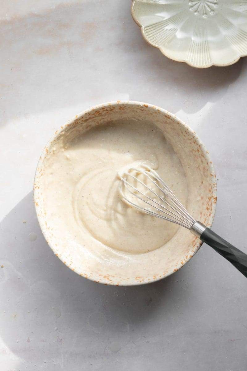 - Add in the oil, egg white, vanilla bean paste, sour cream, and milk. Whisk the ingredients together just until a cohesive batter has formed.