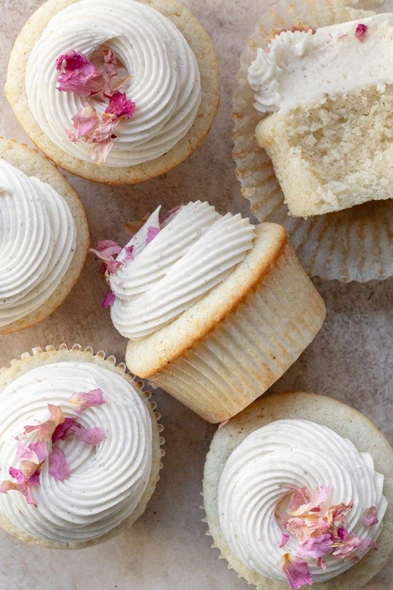 - Once the cupcakes have completely cooled to room temperature, transfer the frosting to a piping bag and frost each cupcake. Top with sprinkles, rose petals, or enjoy them as is!