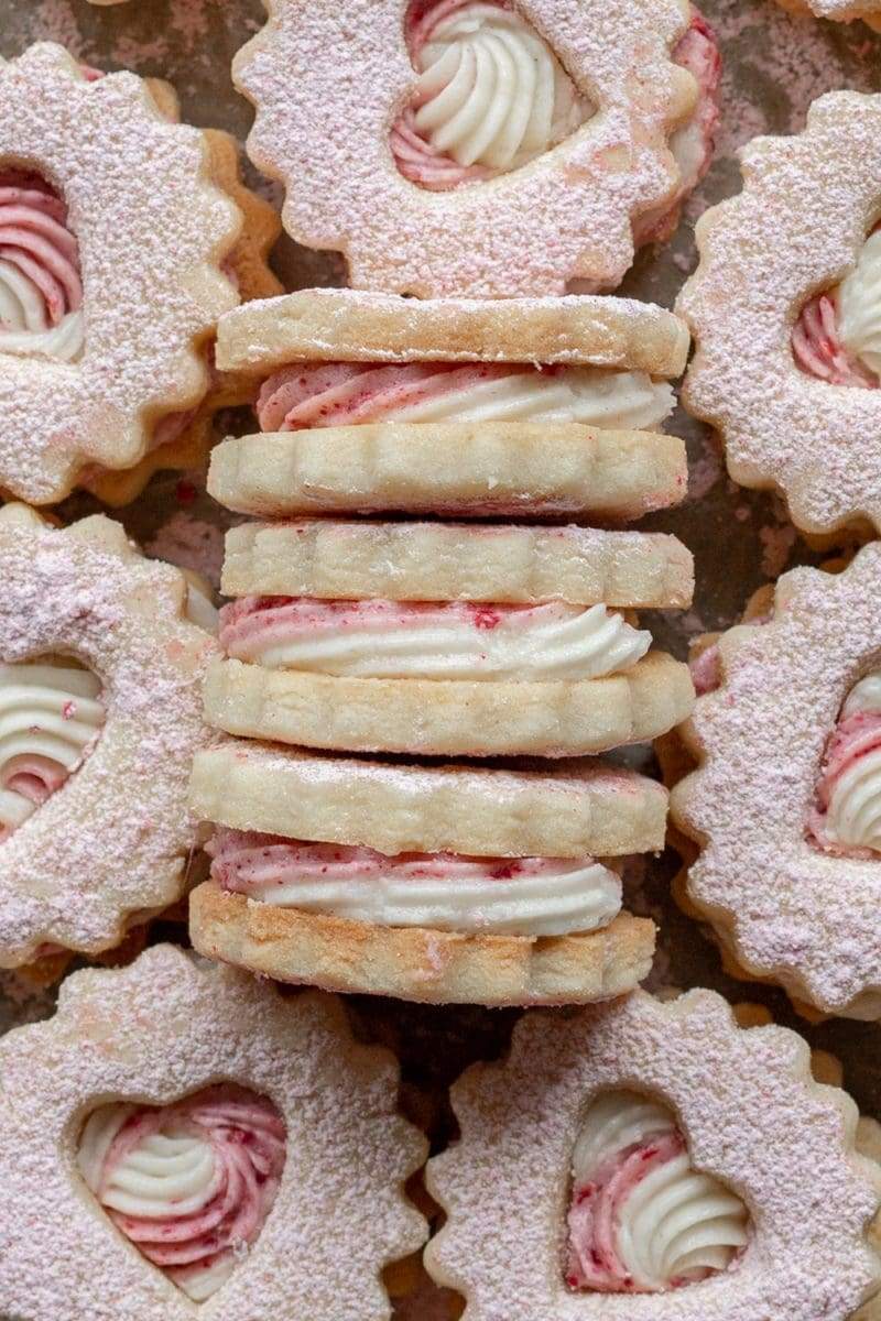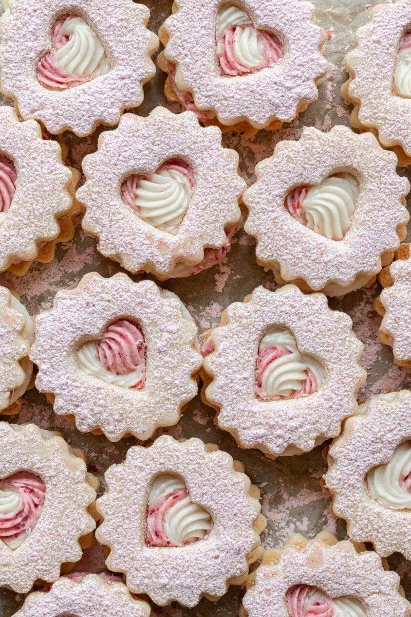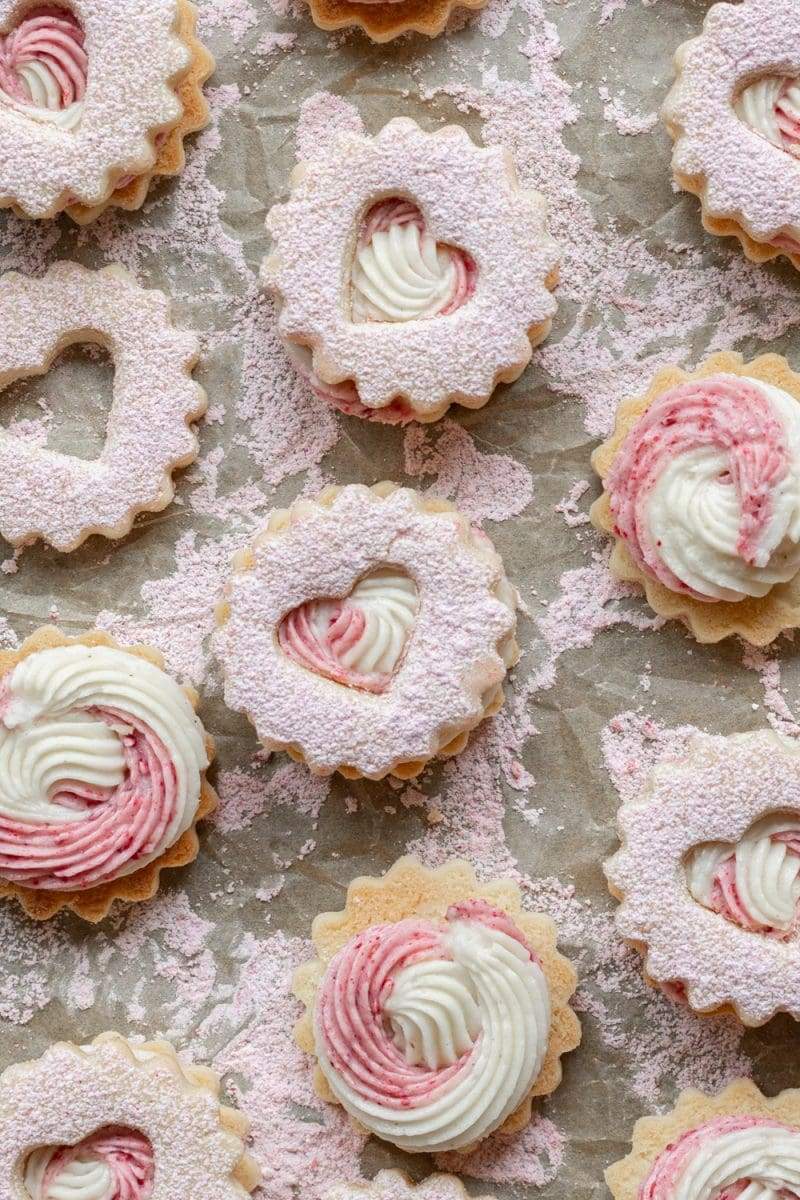 Vanilla linzer cookies filled with ermine buttercream and topped with raspberry powdered sugar.