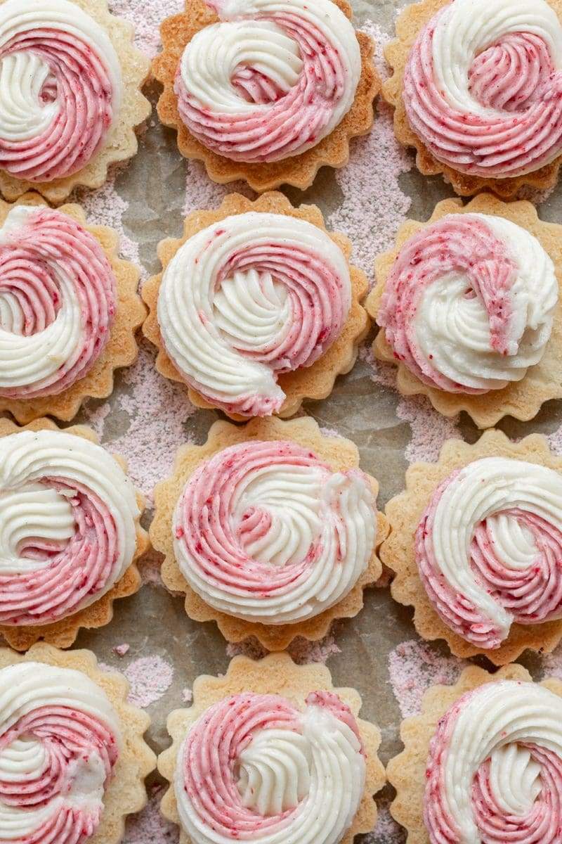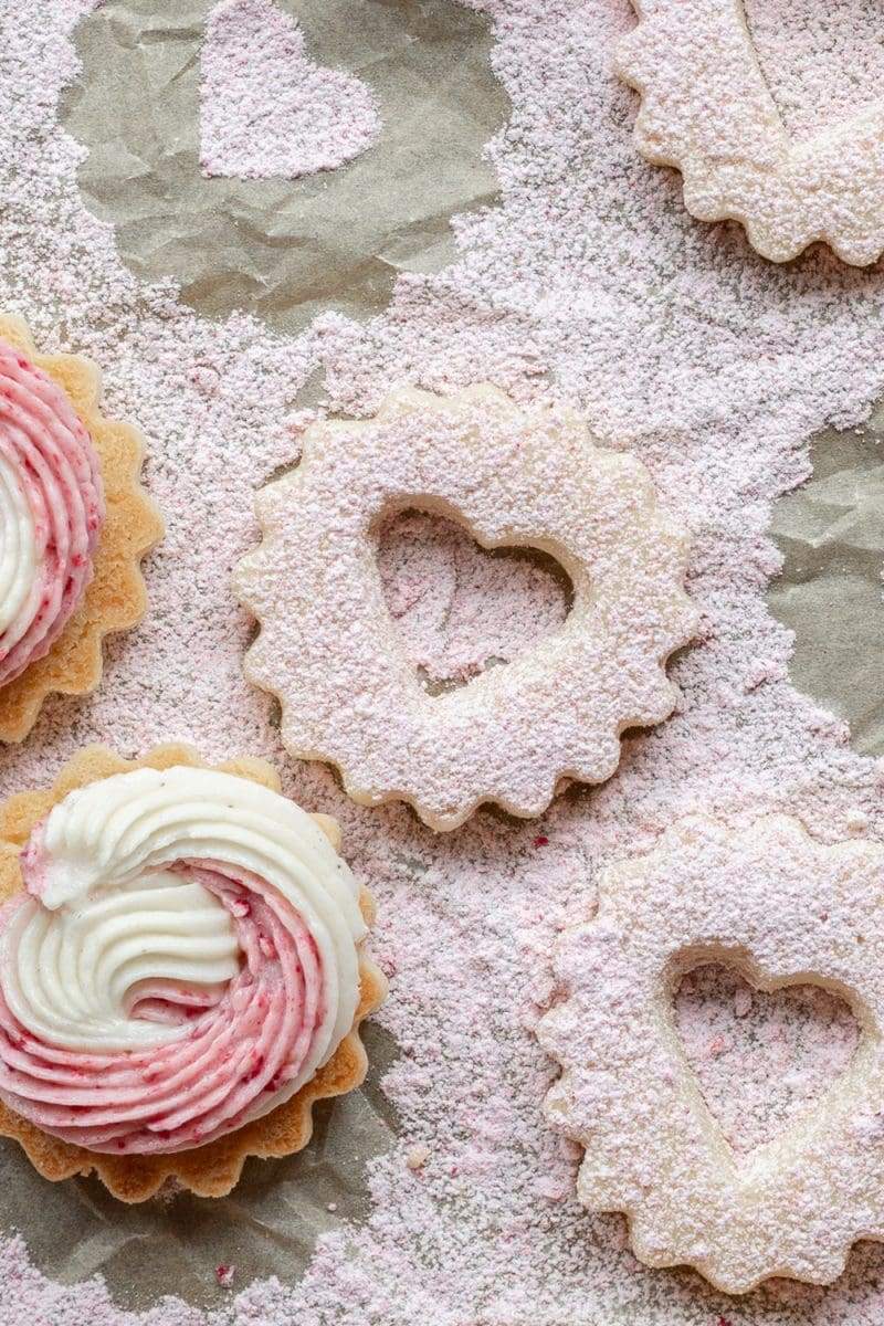 The perfect little snack cookies for Valentine’s Day! Linzer cookies are truly the perfect treat for any occasion. There are endless possibilities of what you can fill them with and what shape you can stamp out on top. Here we’re stamping out a heart (for Valentine’s Day of course), filling them with a two-toned vanilla and raspberry ermine buttercream, and dusting them with raspberry powdered sugar.