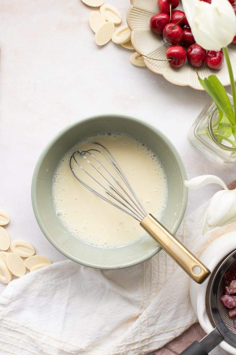 - Beat in the eggs and vanilla until just combined, followed by the heavy cream and white chocolate mixture.