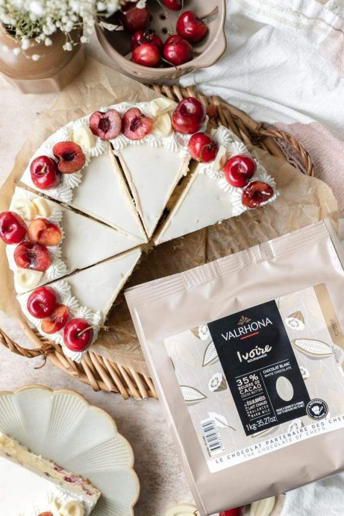 I’m so excited to be able to partner with Valrhona to bring you this white chocolate cherry cheesecake! If you’ve been around a while, you know that I absolutely LOVE their chocolate and it’s my #1 chocolate for all of the cookies on this blog. But today we’re using Valrhona chocolate in a different delicious dessert: cheesecake! I used Valrhona Ivoire 35% white chocolate, which “reveals aromas of warm milk enhanced by delicate vanilla notes.” If you’re not white chocolate’s biggest fan, trust me when I say you will be once you use Valrhona white chocolate! Valrhona white chocolate is flavorful, delicious, creamy, and pairs perfectly with the cherries in the cheesecake and in the mousse. Be sure to check out Valrhona’s store locator to find and buy Valrhona near you!