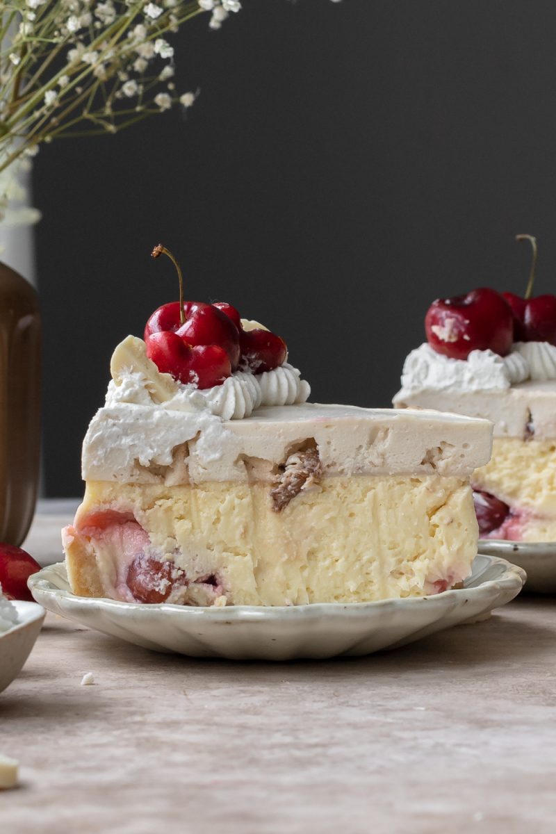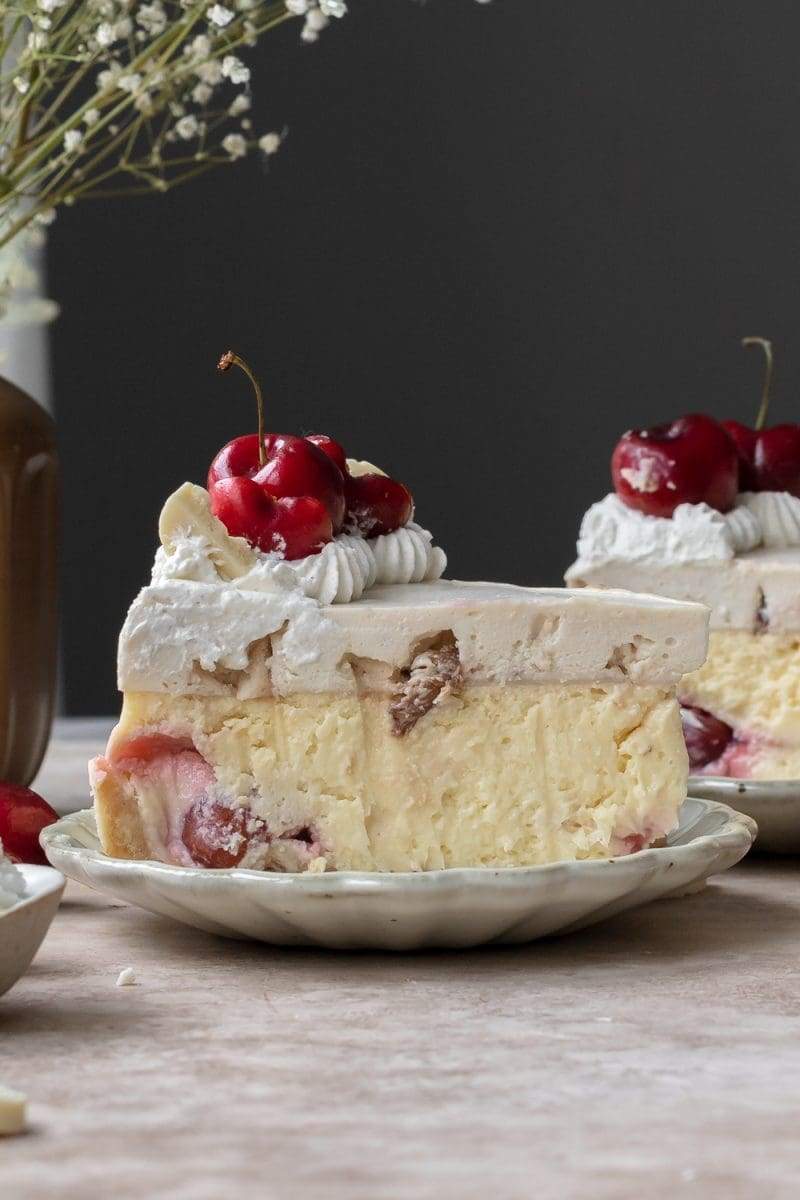 Rich, creamy white chocolate cheesecake swirled with cherries and topped with a cherry mousse.