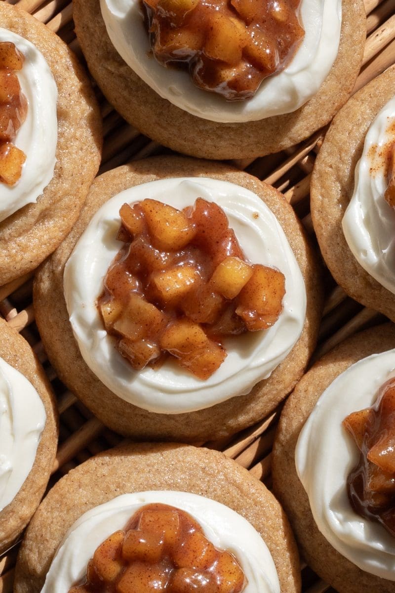 Wait for the cookies to cool down to room temperature before frosting. Generously frost each cookie with the cheesecake frosting, then top each cookie with 1 tbsp. of apple pie filling. Enjoy!