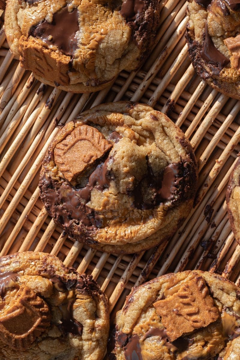 (Optional, but recommended!) Melt 2 tbsp. of cookie butter and use a spoon to spread some on top of each cookie. Top each cookie with additional chocolate and crushed biscoff cookies. Bake for 12-14 minutes, or until the edges of the cookies are golden brown.