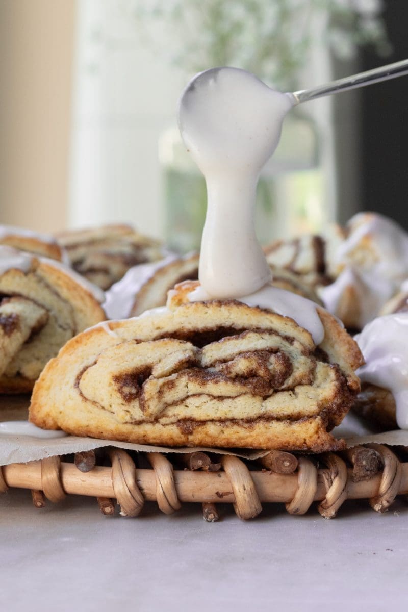 Slice a small sliver of dough off of both ends of the log to reveal the cinnamon swirl. Slice the log into 4 equally sized pieces, then slice each piece on a diagonal to create a triangle shaped piece.